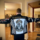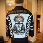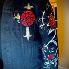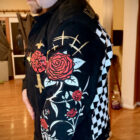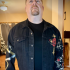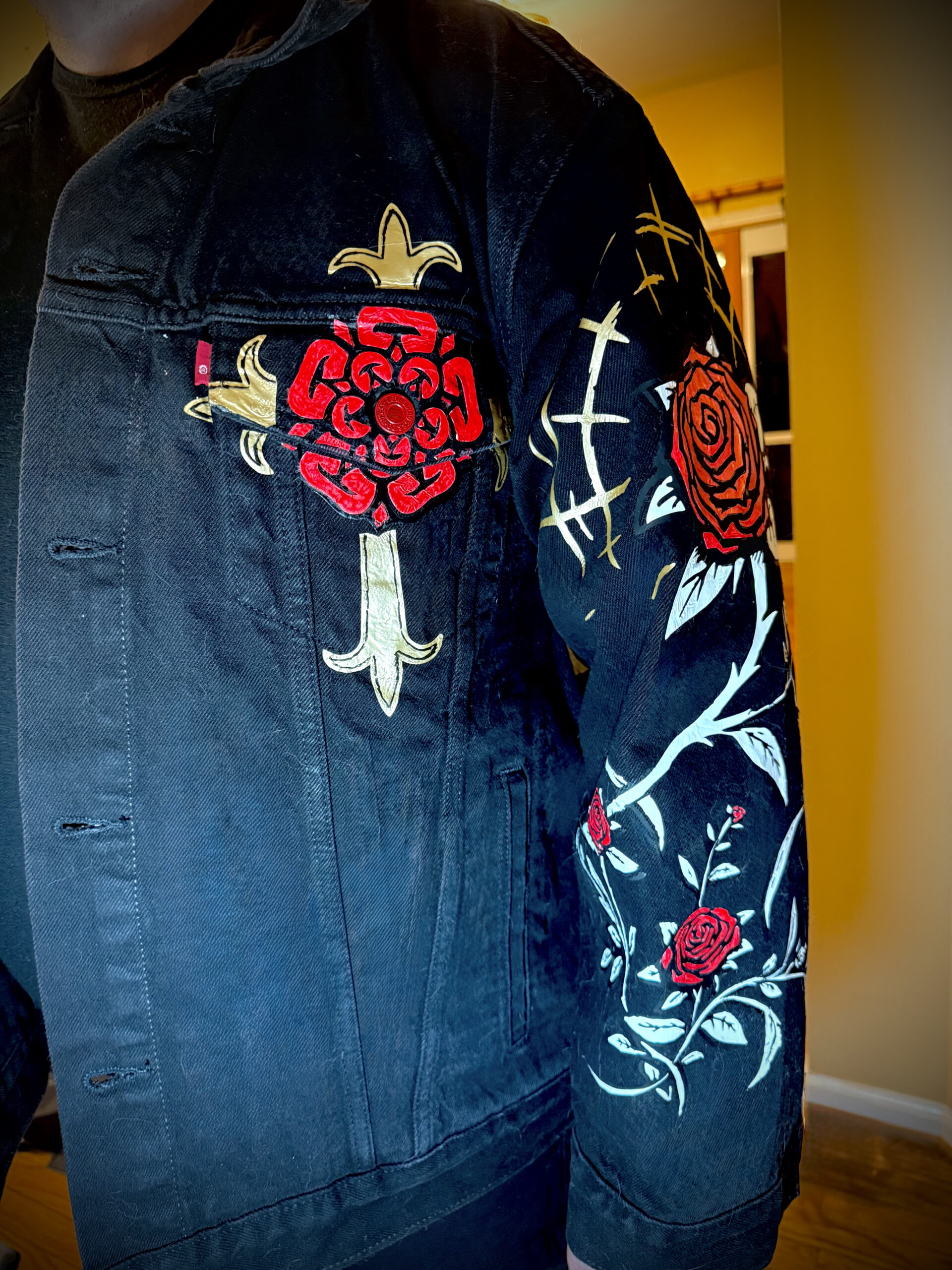 - Base: Authentic Levi’s black denim trucker jacket (classic fit, distressed for authentic battle-jacket character)