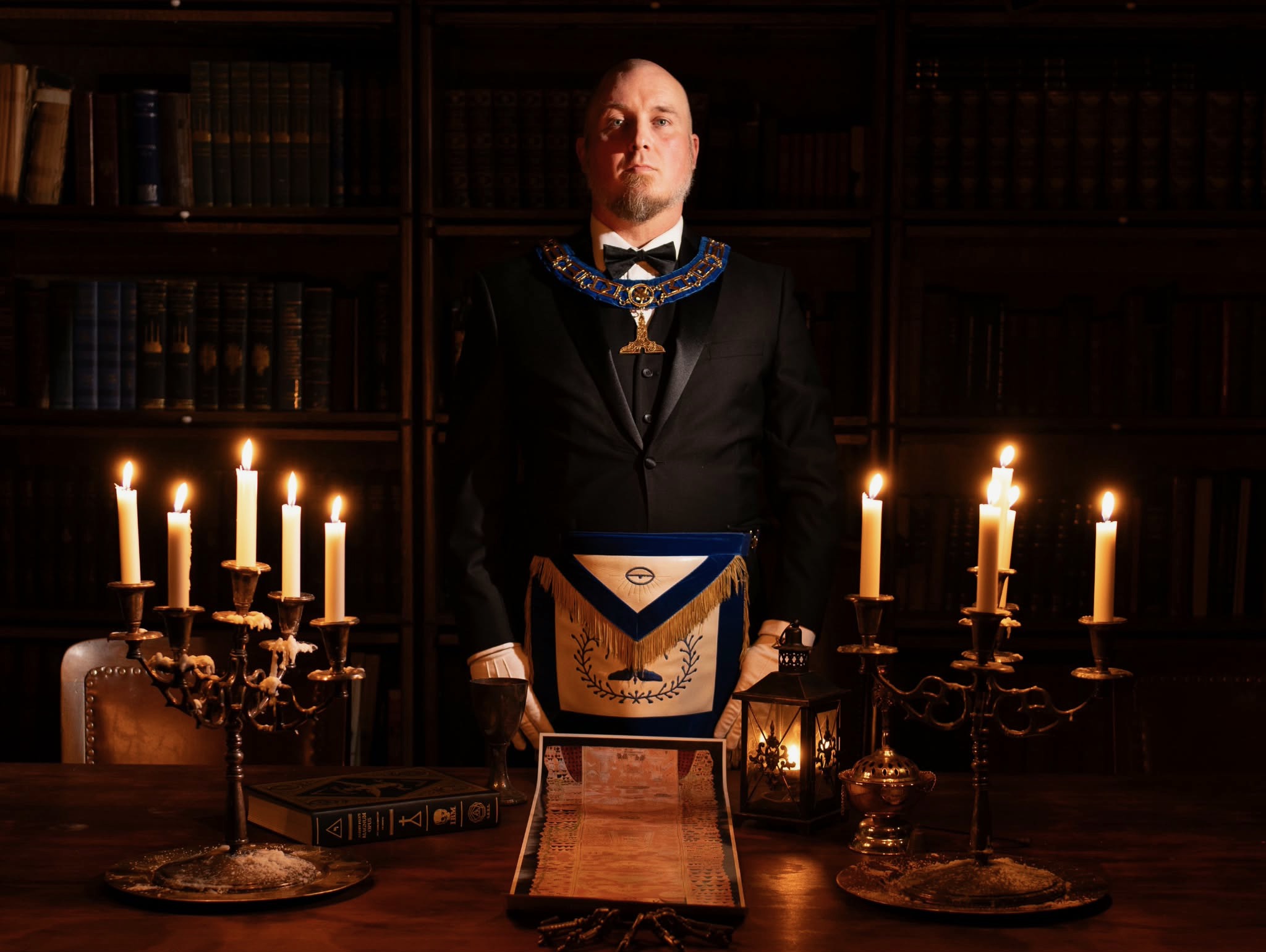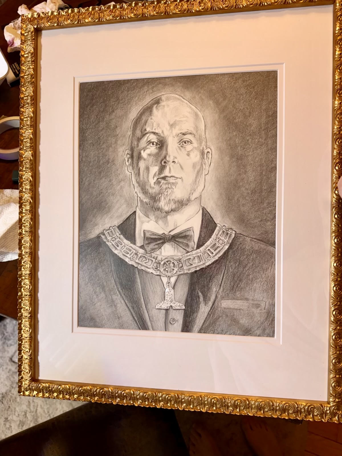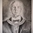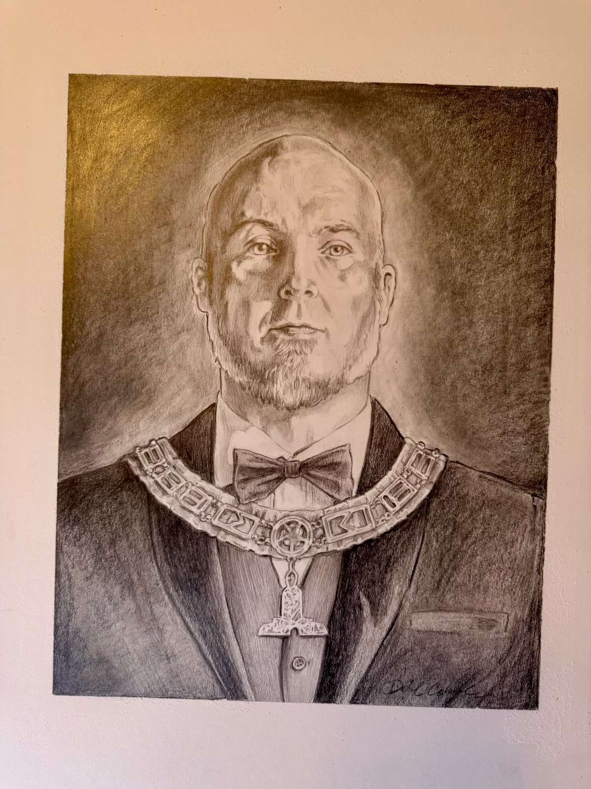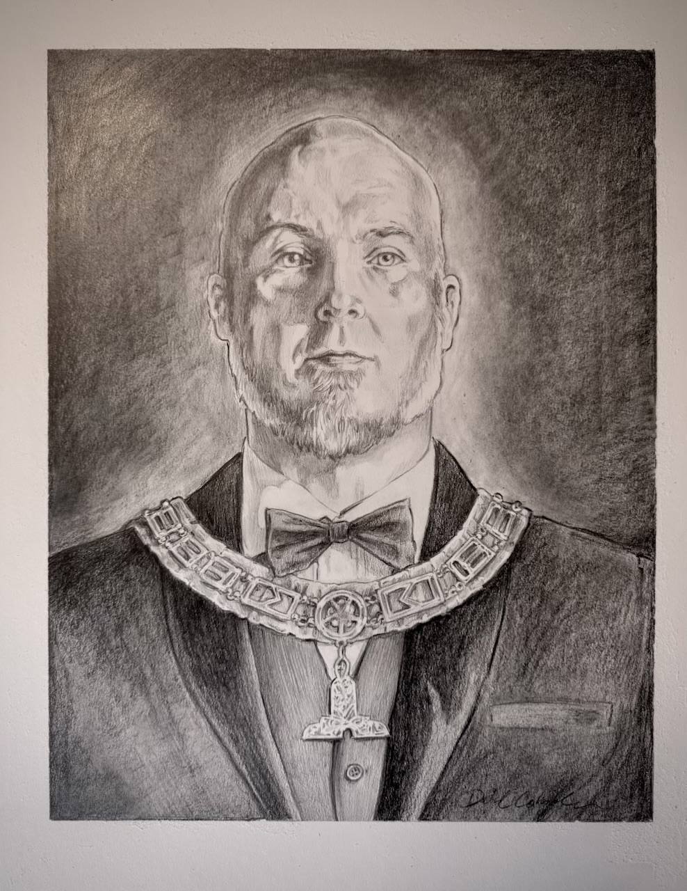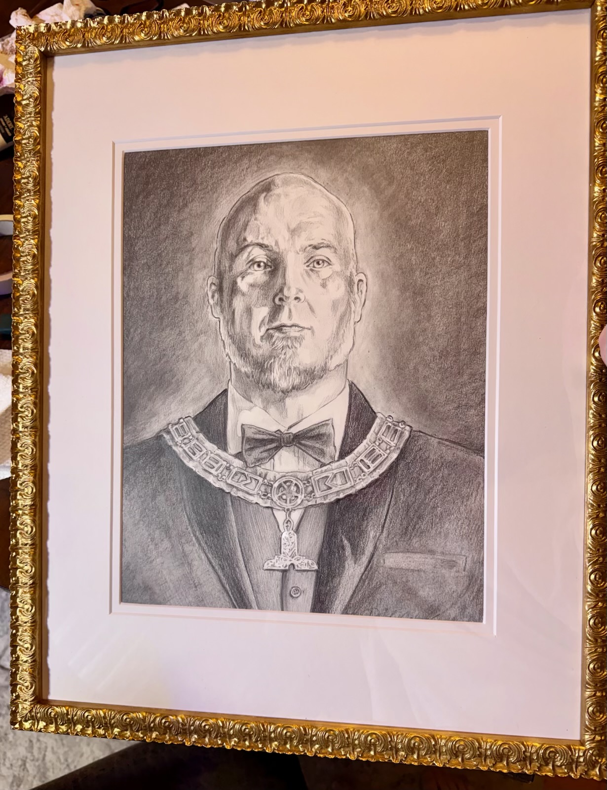 This striking, original pencil portrait captures the quiet dignity and timeless symbolism of a Master Mason in full regalia. Rendered entirely by hand with meticulous attention to detail, the work portrays the subject standing in solemn composure, wearing the Senior Warden jewel.
