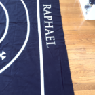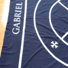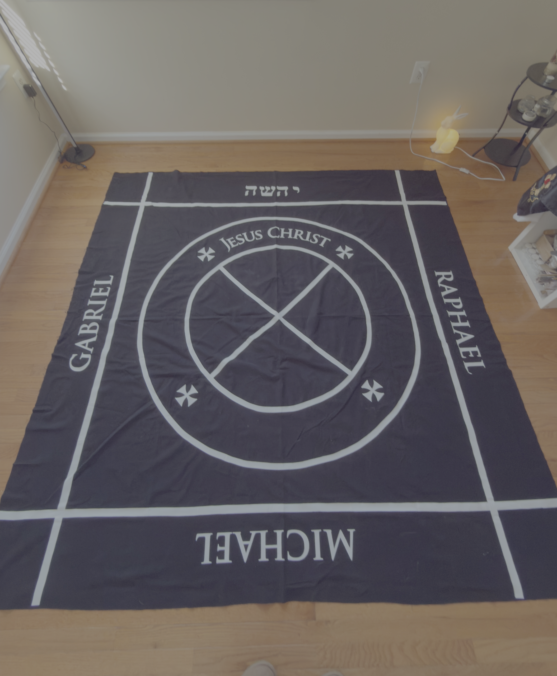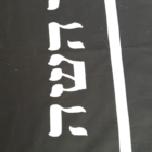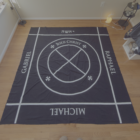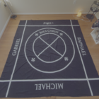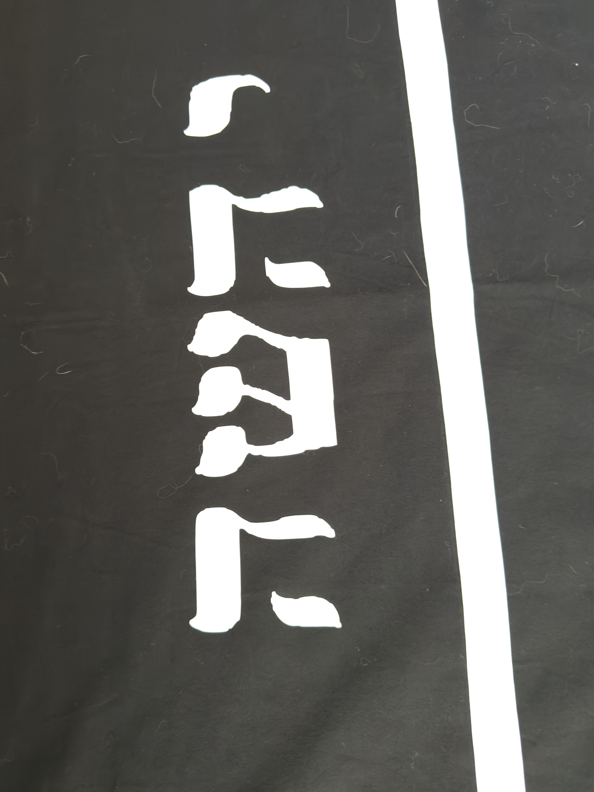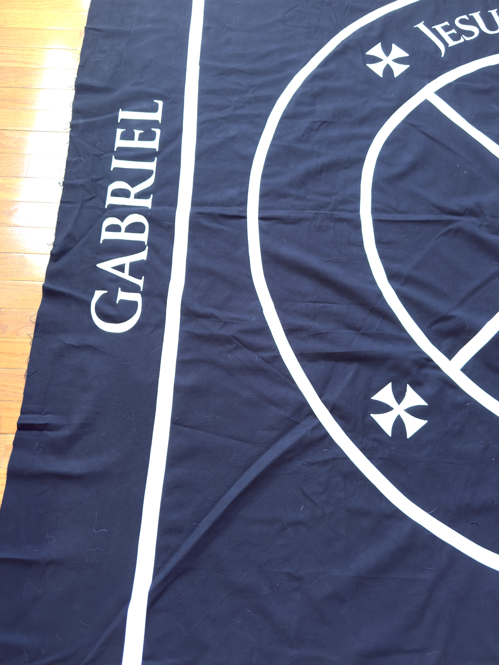 7′ × 7′ vinyl print on organic cotton — all natural fabric. White on black.