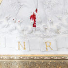 Rendered in fine plasticine with meticulous hand-modeling and delicate gold leaf accents, the piece captures the moment of supreme self-sacrifice—the pelican piercing her breast to nourish her young with her own blood. The central bird, wings spread in protective embrace, feeds seven fledglings in a nest of white plumage, while a vivid crimson stream of life-giving blood flows downward, pooling in symbolic richness. The pelican’s eyes are set with brilliant fire opals that catch the light with fiery intensity, while the baby pelicans are adorned with tiny, sparkling jewels that represent the precious souls nourished by divine love. At the apex, a golden crown rests atop a radiant Cross, encircled by the sacred letters I.N.R.I. in gleaming gold, evoking both the traditional inscription and its esoteric interpretation: Igne Natura Renovatur Integra — “By fire, nature is renewed whole.”