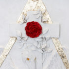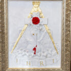 • Medium: Hand-sculpted plasticine bas-relief with gold leaf, red pigment, fire opals, and jewel accents